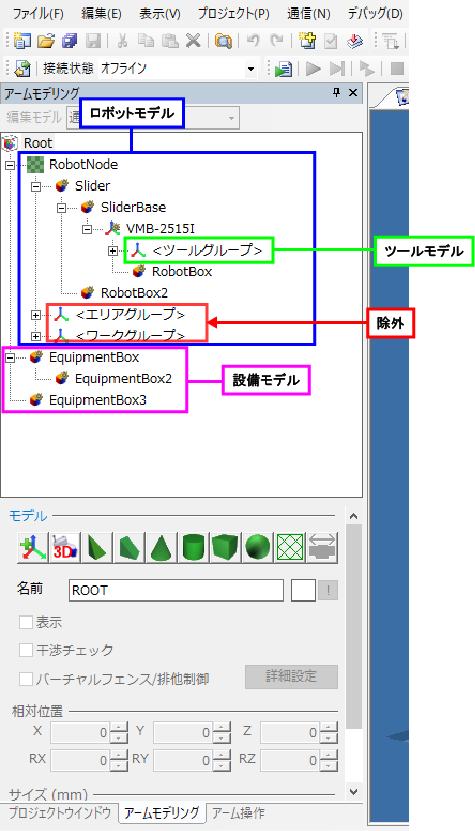 | ロボットモデル | Robot Node以下で、ツールグループ、エリアグループ、ワークグループ、排他グループ以下を除くオブジェクト。 | - |
