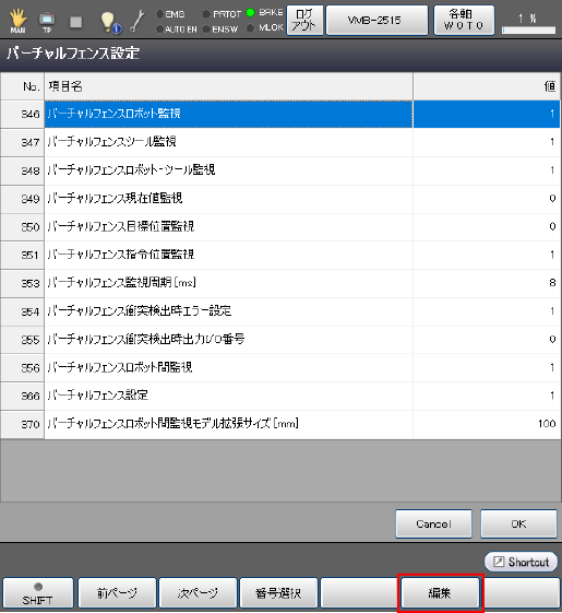監視の設定を行います。[F7 設定]を押すと各パラメータが表示されますので、[366 : バーチャルフェンス設定]を有効にし、必要があれば他パラメータのデフォルト値の変更を行います。値の変更は[F5 編集]を押してください。