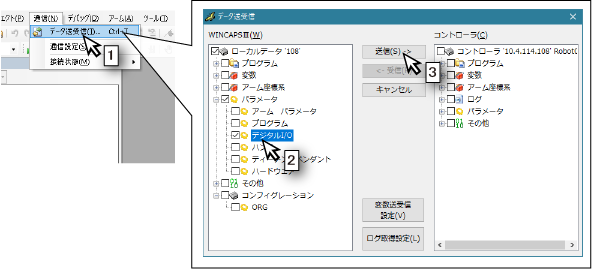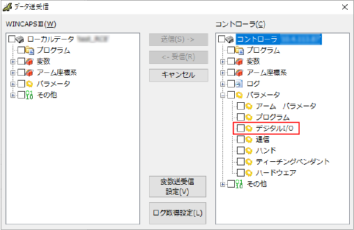 ロボットコントローラのデータをWINCAPSIIIに受信する方法は、"データの送受信"を参照してください。"デジタルI/O"データは、[データ送受信]ウィンドウのコントローラのデータ一覧にある"パラメータ"を開くと表示されます (下図参照)。