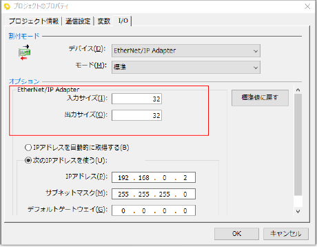 マスタ側の入出力サイズに合わせて、ロボットコンローラ側の値を設定する場合は4byte少ない値を設定する必要があります。