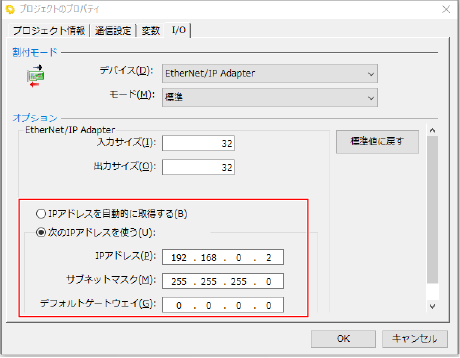 EtherNet/IP で使用するIPアドレスをDHCPで自動的に取得するか、または指定するかを選択します。指定する場合には詳細を設定します。
