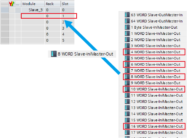 下記の例は、入出力各16byteを設定する場合です。入出力とも8wordのモジュールを追加します。