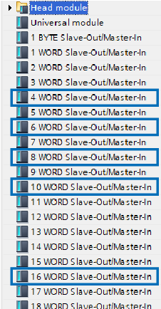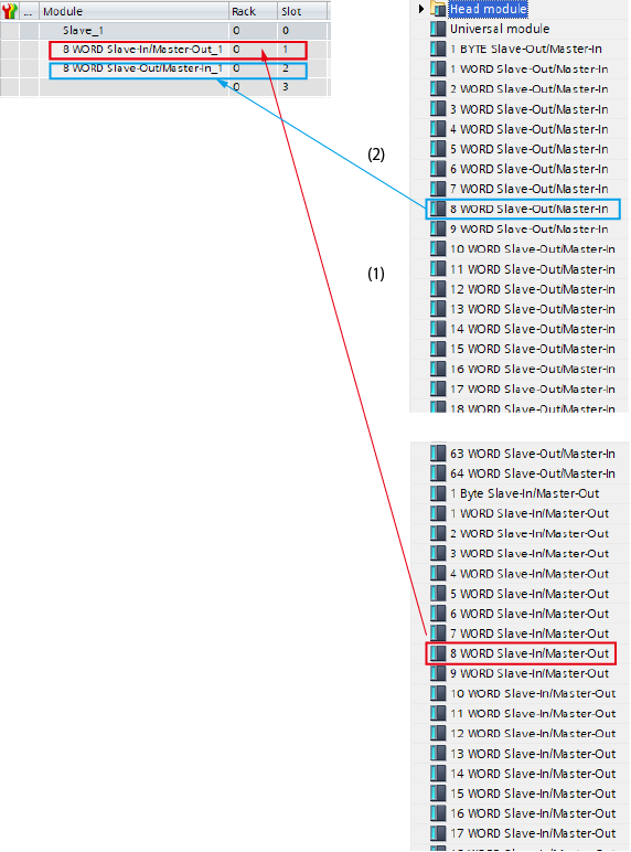 「Head module」のリスト中から、設定したい出力のbyte数をドラッグして、空いているスロットへドロップします。