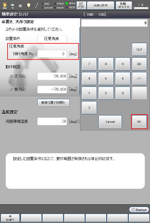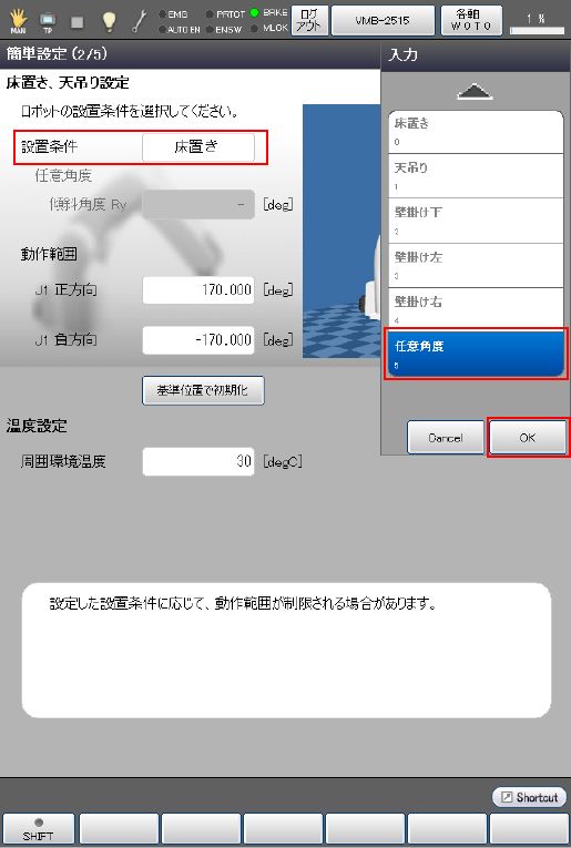 ロボットを床置きで使用する場合と、天吊り、壁掛け、傾斜面(任意角度)で使用する場合では、最適な運転条件が異なります。床置き、天吊り設定では、実際のロボットの設置状況と一致するように設定を行います。