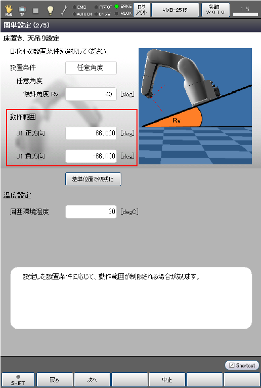 設置条件に"壁掛け"、"傾斜角度"を選択した場合、1軸の動作範囲が制限されます。