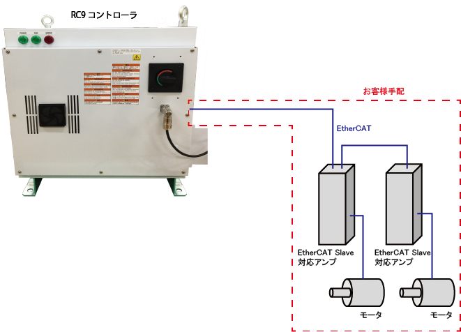 付加軸機能では、RC9ロボットコントローラとサーボアンプの接続にはEtherCATを利用します。