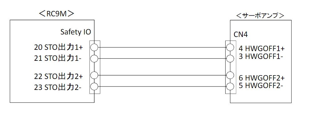 ロボット軸と付加軸のSTO信号を同期させるには、以下のように、RC9からSTO信号線を付加軸アンプに接続してください。