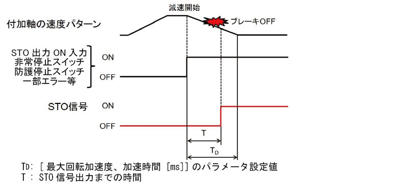 をSTO 信号出力までの時間 Tより長くしたい場合、STO信号の信号線にオフディレイタイマー等の遅延回路を接続してください。
