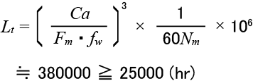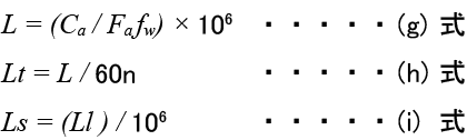 疲れ寿命は、一般に総回転数で表すが、総回転時間、あるいは総走行距離で表すこともある。疲れ寿命は次式により求められる。