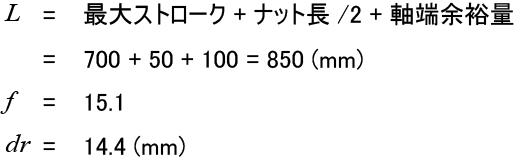 ボールねじの回転数が、ねじ軸の持つ固有振動数と共振しないよう検討する必要がある。この危険速度の80%以下を許容回転数とする。