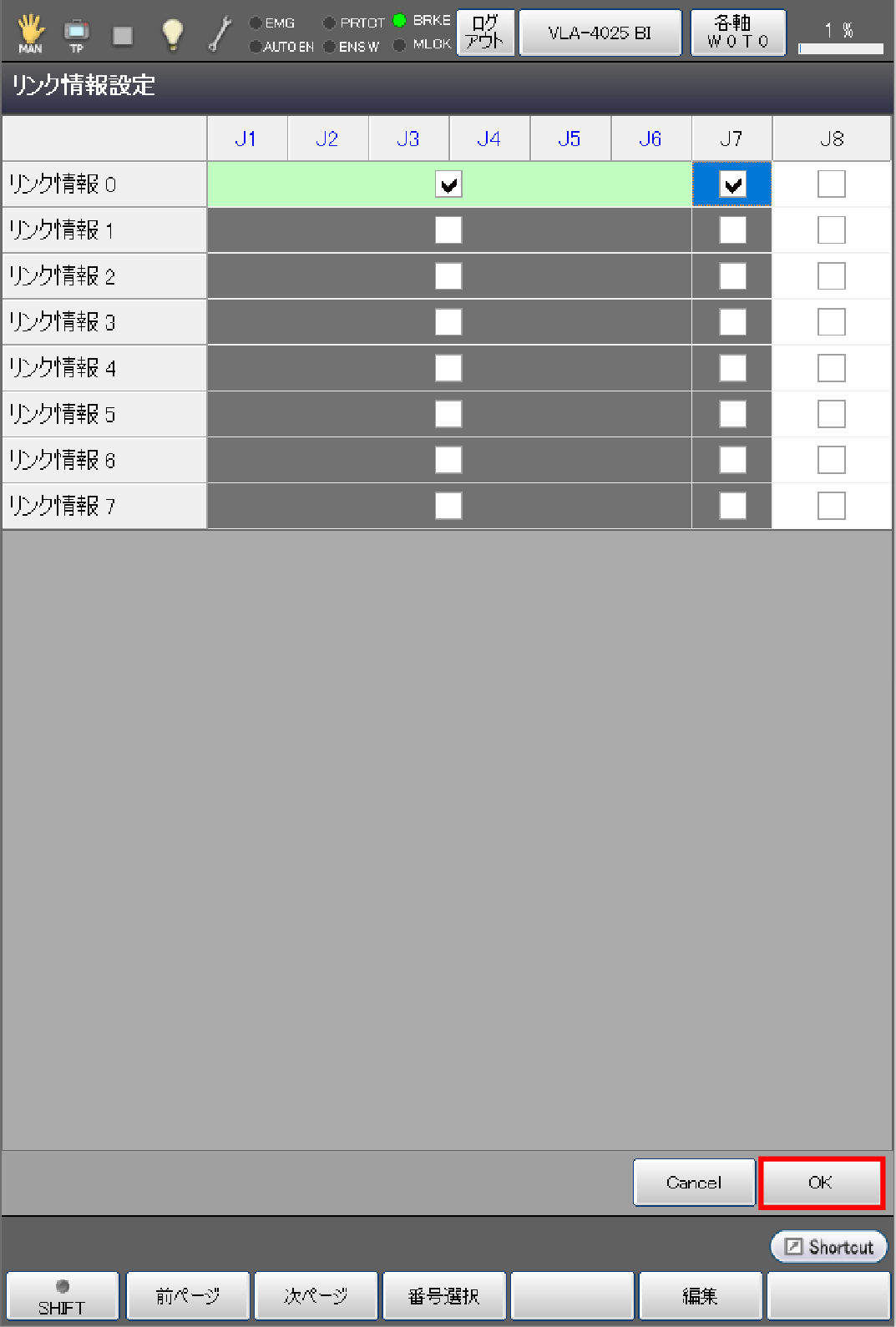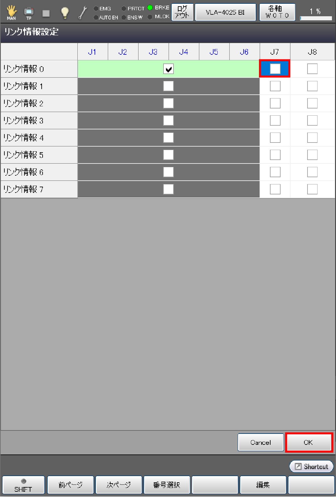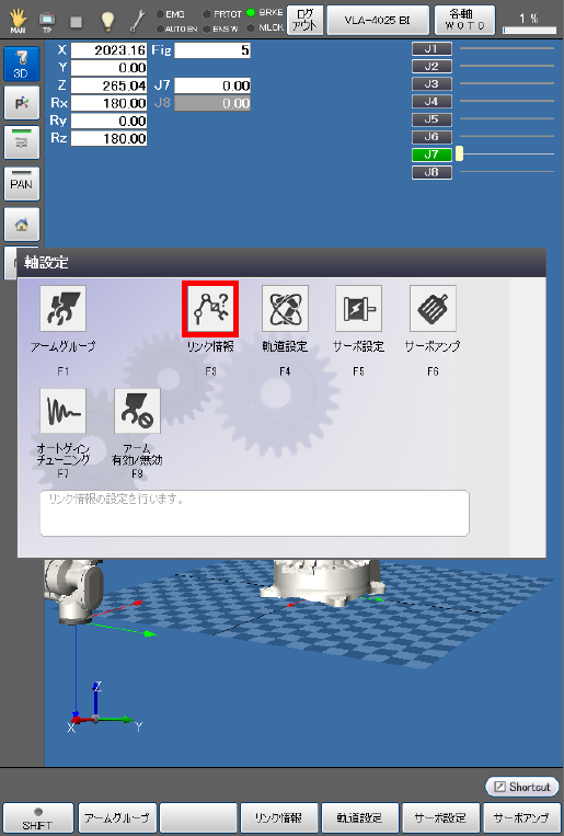 基本画面 - [F2 アーム] - [F12 保守] - [F10 軸設定] - [F3 リンク情報]を押します。