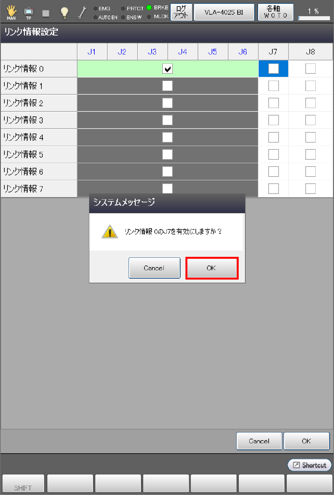 リンク情報1:ロボット軸(J1~J6)と付加軸(J8)はリンクしますので、ロボット軸の動作と付加軸(J8)の動作は相互に影響します。