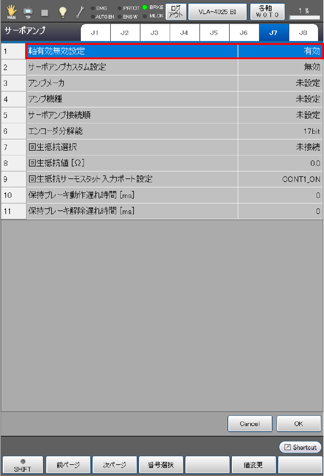 操作経路:[F2 アーム] - [F12 保守] - [F7 軸設定] - [F5 サーボ設定]