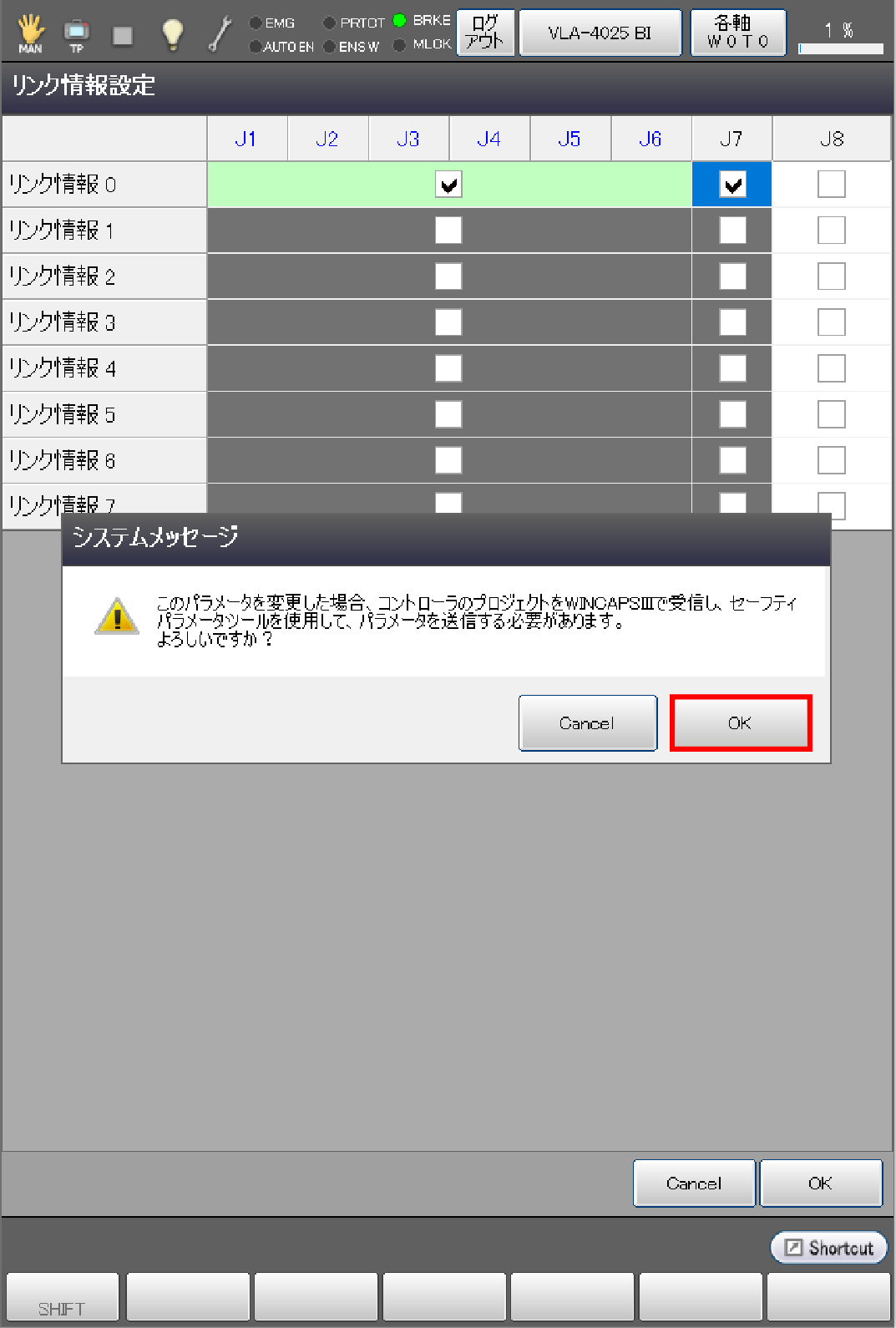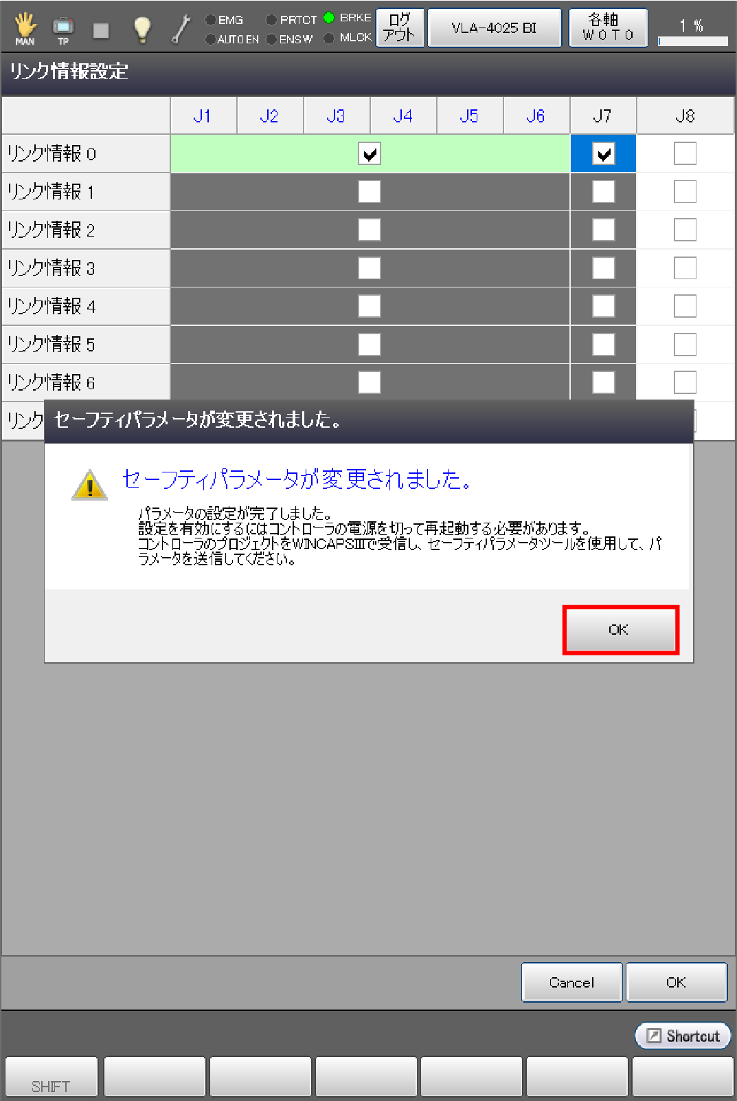 [OK]を押すと、セーフティパラメータが変更されるメッセージが出ます。