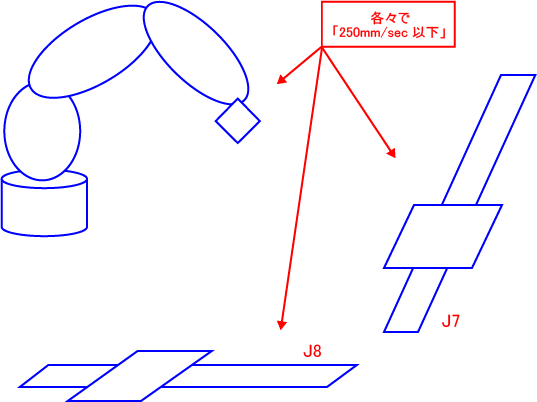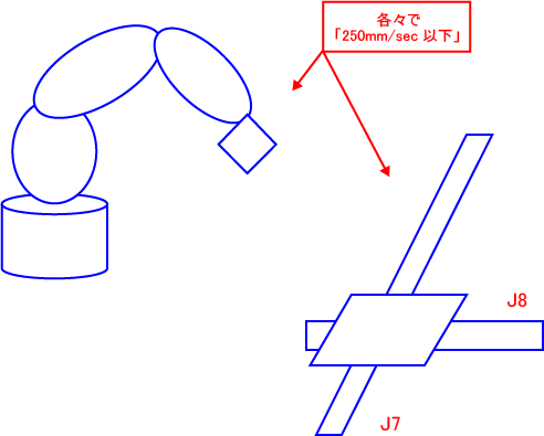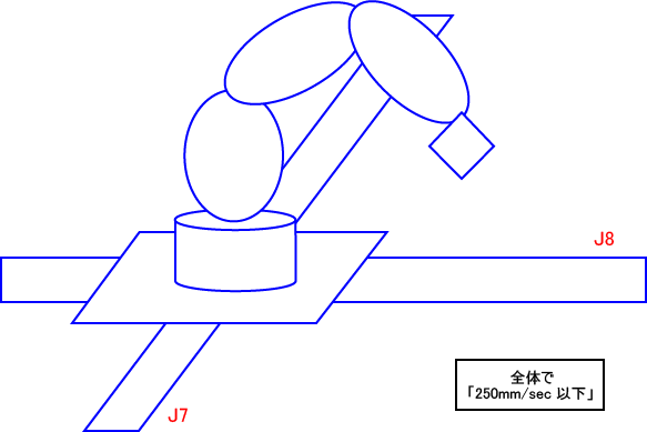 この場合はロボット軸動作、付加軸(J7)および付加軸(J8)動作の各々は別々に動作速度の制限の対象になります。