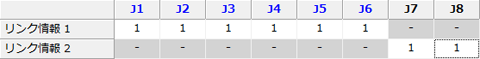 上図のような構成の場合、付加軸(J7、J8)の動作はロボット軸の動作に対して影響をしないため、ロボット軸と付加軸(J7、J8)は[リンクしない]に設定します。また付加軸(J7)と付加軸(J8)についても相互の動作に影響をしないため、付加軸(J7)と付加軸(J8)も[リンクしない]に設定します。