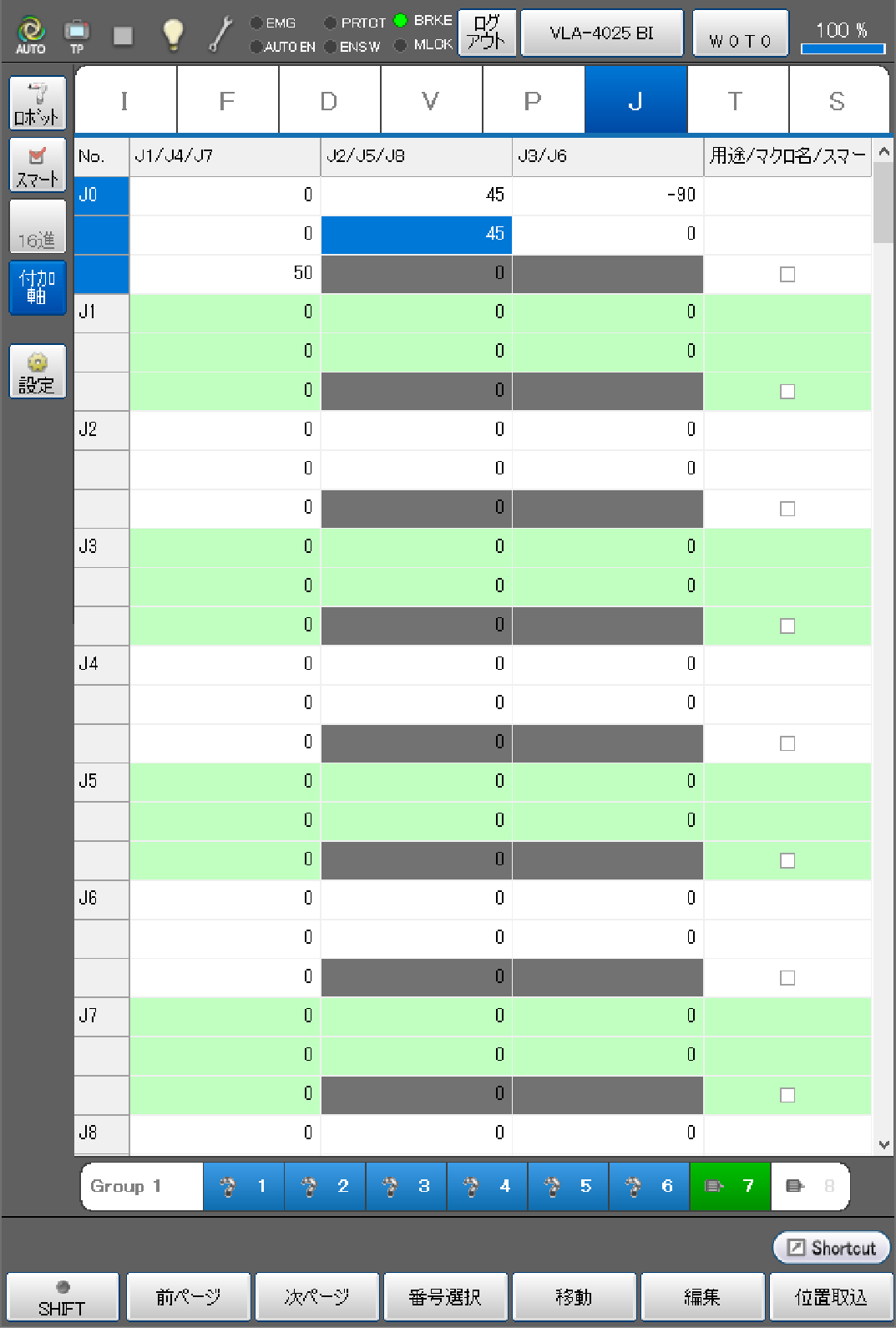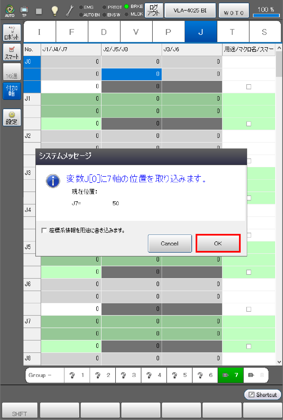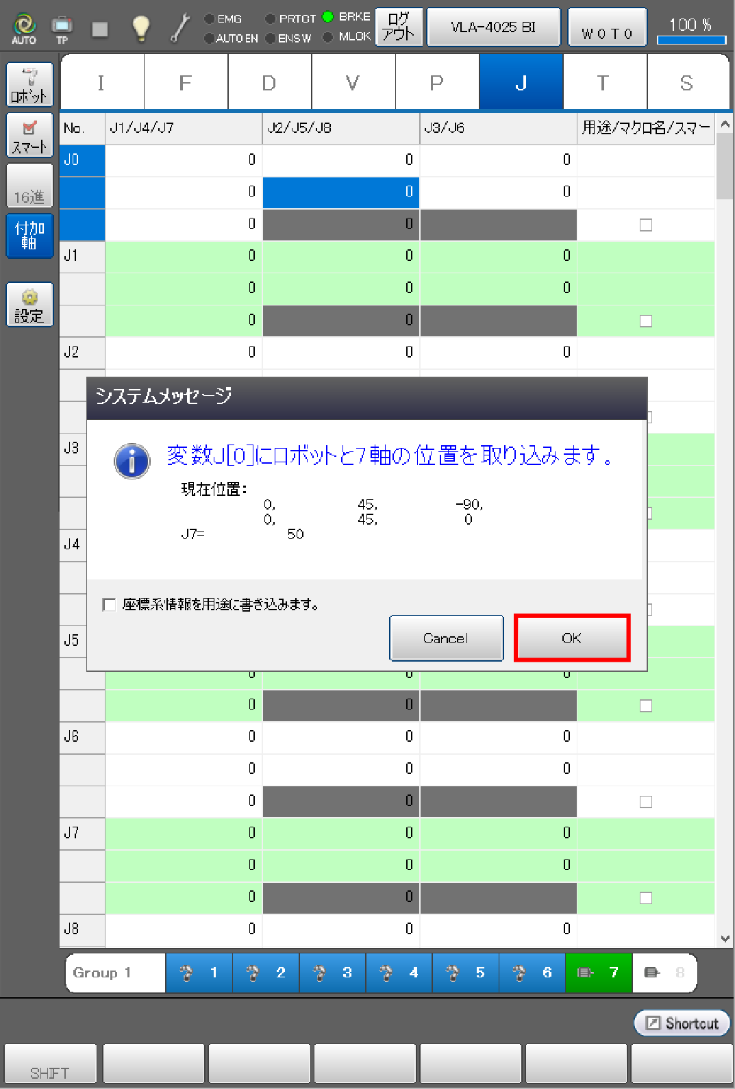 目標位置を取り込む際に、ロボット軸と付加軸を同じアームグループに登録することで、ロボット軸と、付加軸の現在位置をJ型変数の同じ変数番号に同時取込みができます。