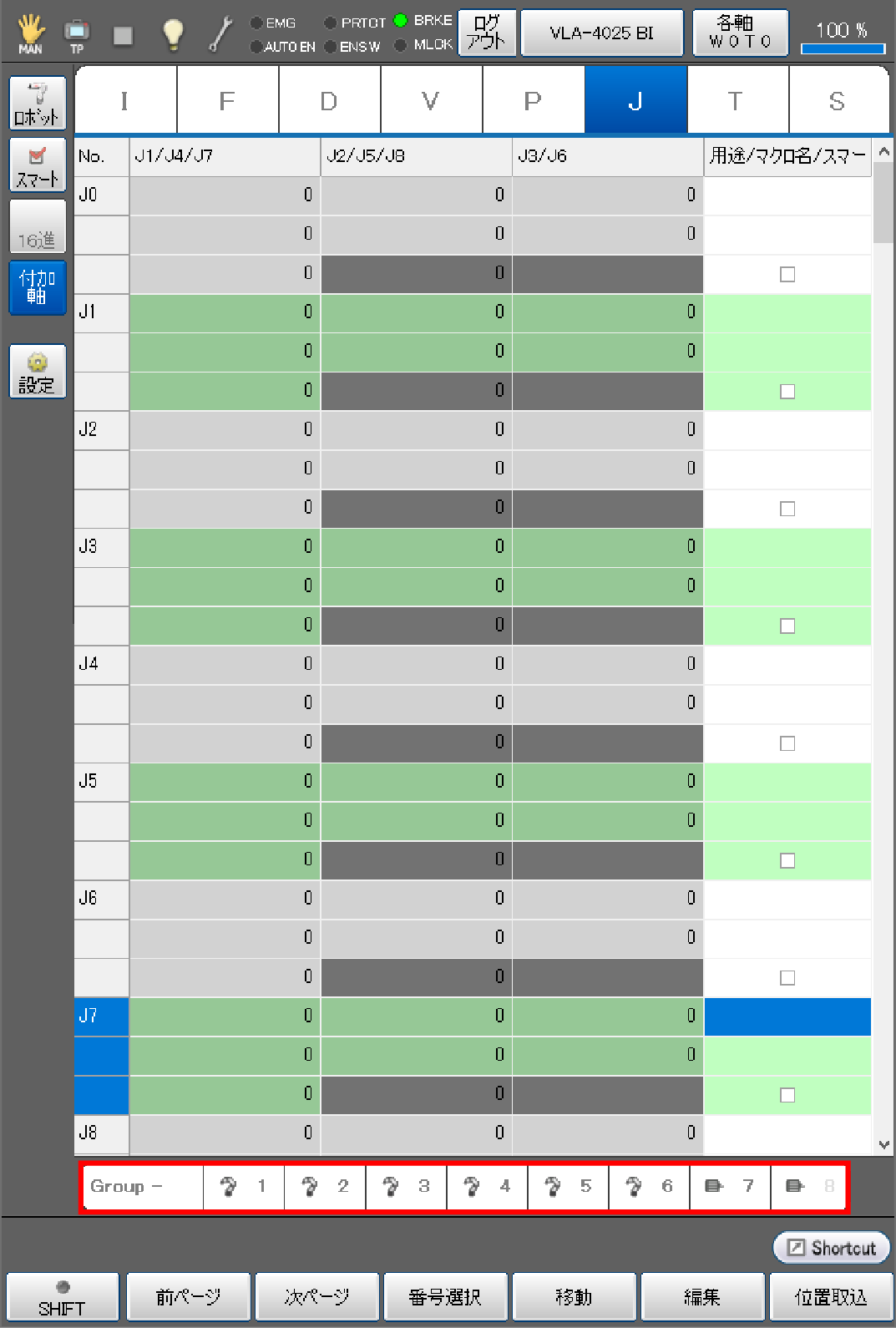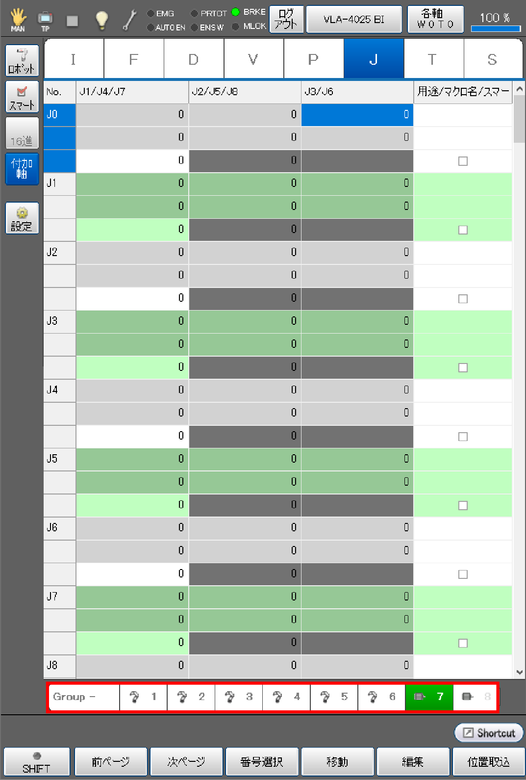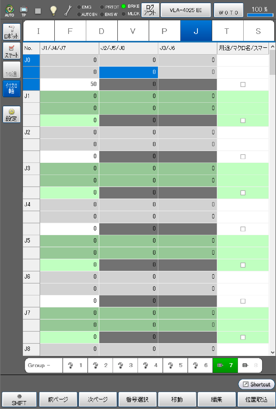 目標位置を取り込む際に、ロボット軸と付加軸を同じアームグループに登録することで、ロボット軸と、付加軸の現在位置をJ型変数の同じ変数番号に同時取込みができます。