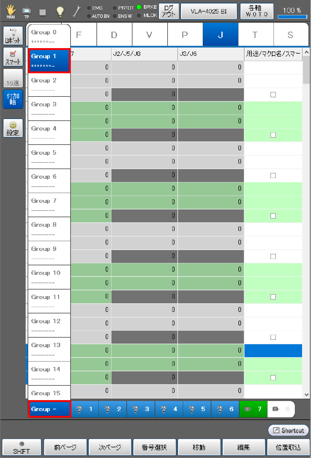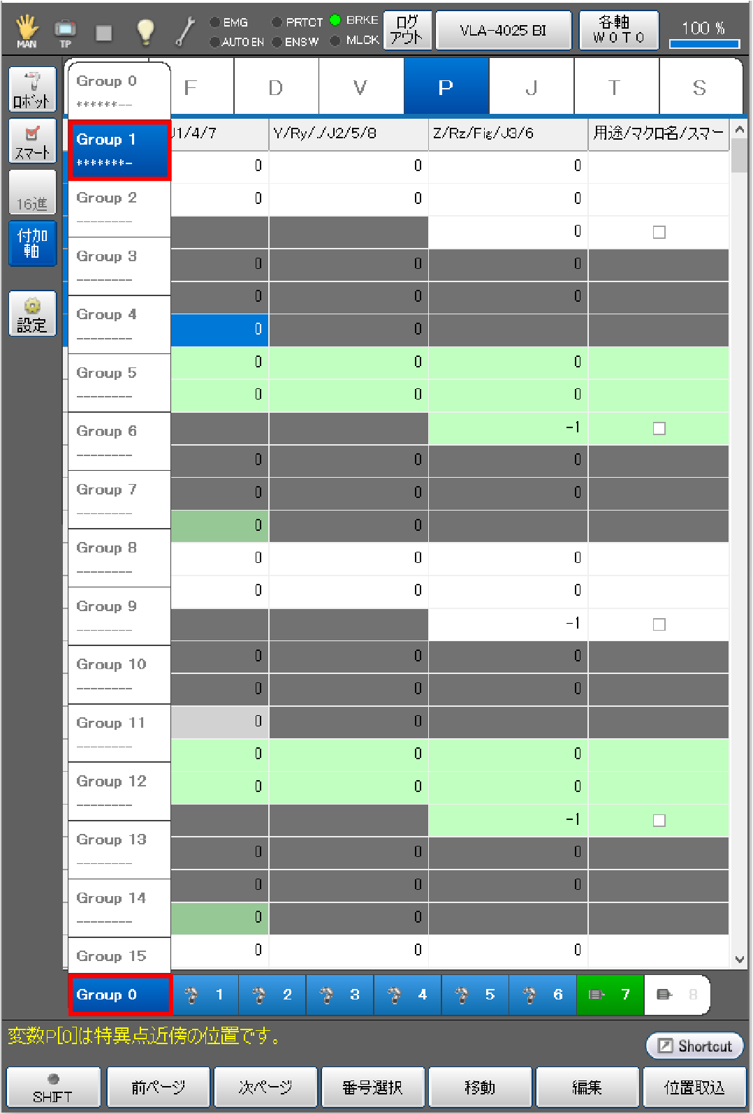 アームグループリスト部分の、ロボット軸を表す1~6のどれかを選択することで、ロボット軸の現在位置を取得せずに、付加軸の位置のみを取得することも可能です。