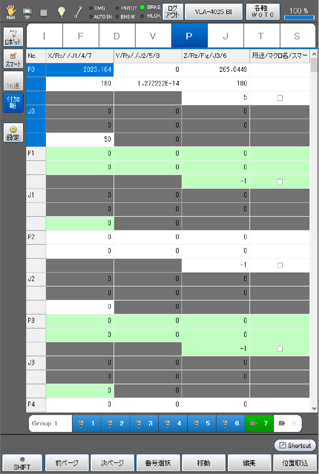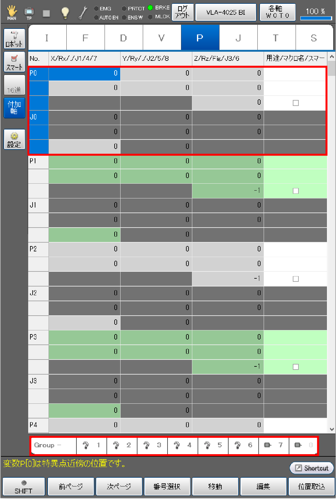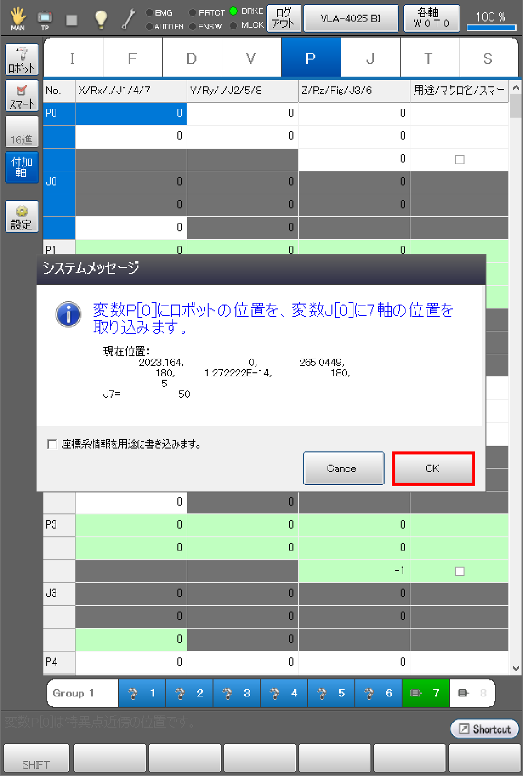 目標位置を取り込む際に、ロボット軸と付加軸を同じアームグループに登録することで、ロボット軸の現在位置をP型変数に、付加軸の現在位置のみをJ型変数の同じ変数番号に同時取込みができます。