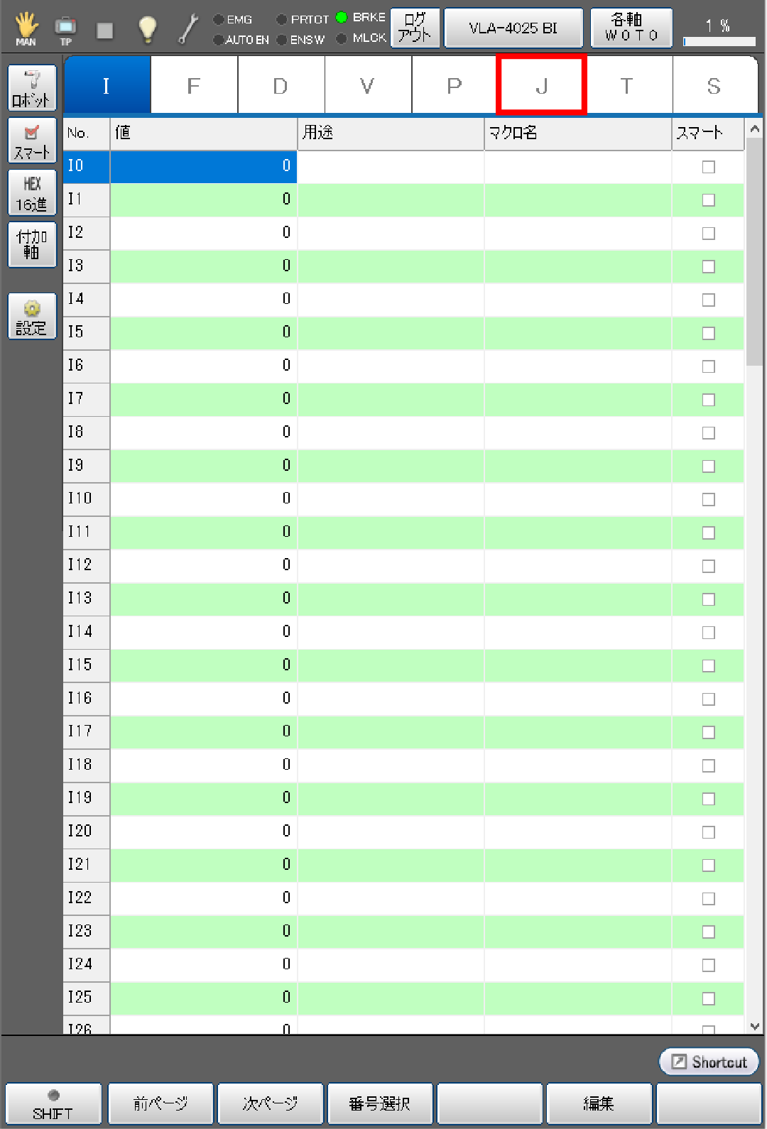 基本画面 - [F3 変数] - [J型変数]タブを選択します。