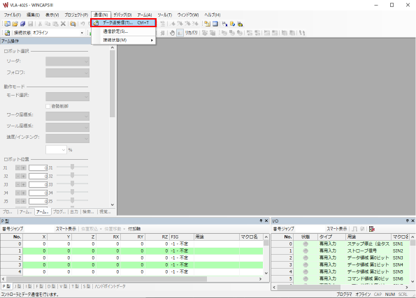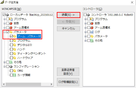 正しく設定を行った後、使用しているRC9ロボットコントローラへ、データ送受信を利用し、[アーム パラメータ]を送信します。