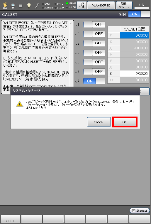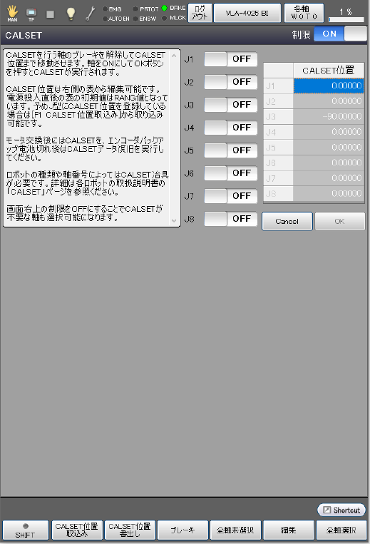 ロボット軸をCALSETすると、ロボットの基準角度が変化します。誤ってロボット軸をCALSETしないようにご注意ください。