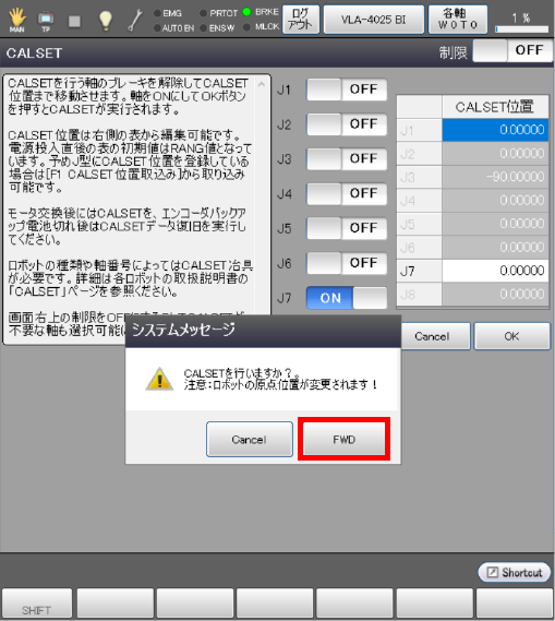 [OK]を押した場合、以下のCALSETを行うかのシステムメッセージが表示されますので、よければ[FWD]を押します。
