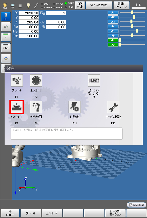 基本画面 - [F2 アーム] - [F12 保守] - [F7 CALSET]を押します。