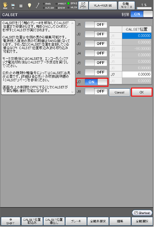 CALSETを行う軸番号を選択し、ボタンを押します。"OFF"が"ON"に変更されます。