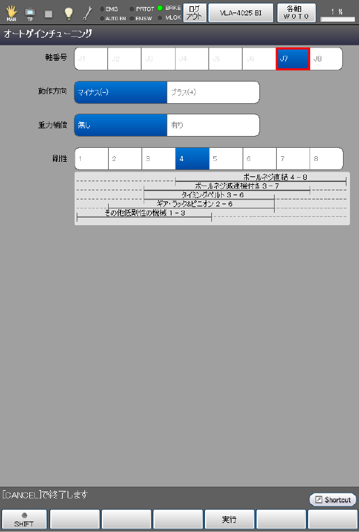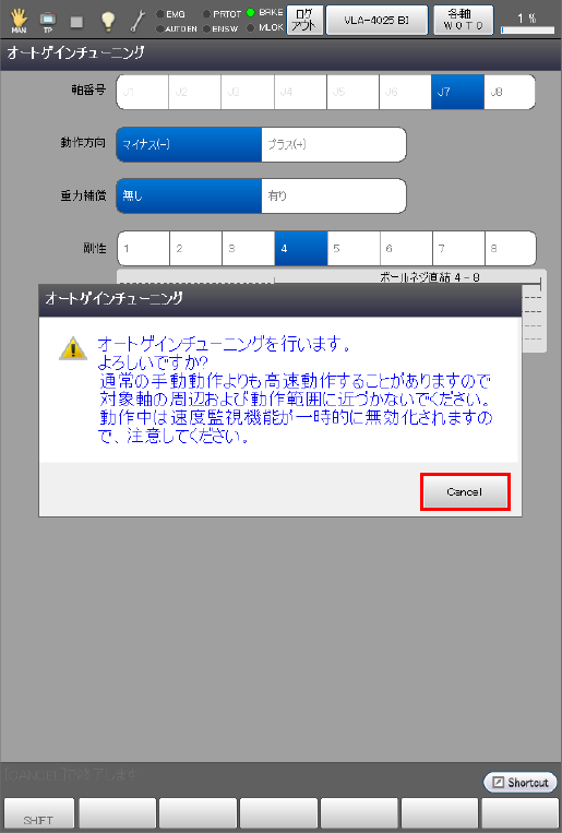 オートゲインチューニング動作時は、イネーブルスイッチと[FWD]ボタンを押した状態で実行してください。オートゲインチューニング動作中にイネーブルスイッチまたは、[FWD]ボタンをはなすと、オートゲインチューニング動作が中断します。