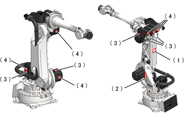 ロボット本体には、下記の警告ラベル・注意ラベルが貼ってあります。貼付部付近には特有の危険がありますので、ラベルの記載事項は遵守してください。