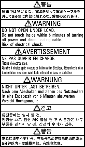 また、電源を切って電源ケーブルを外した後も6分間はコントローラ内部に触れないでください。