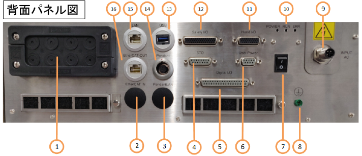 | 3 | ペンダントLAN入力コネクタ | お客様準備のIPCからペンダント制御信号用の LANケーブルを接続します。(IPCレス仕様のみ) |