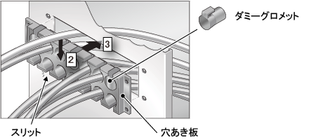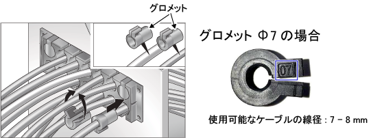 各ケーブルに適合するグロメットでケーブルをはさみ、穴あき版の穴にグロメットを挿入します。