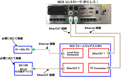 MC9コントローラ(IPCレス)を動作させる場合、以下の接続図のようにRC9ファームウェアのインストールされたIPCと、MC9コントローラ(IPCレス)を接続して下さい。