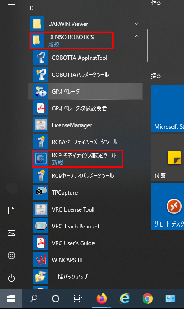 操作経路:PC[スタート]ボタン - [DENSO ROBOTICS] - [RC9キネマティクス設定ツール]