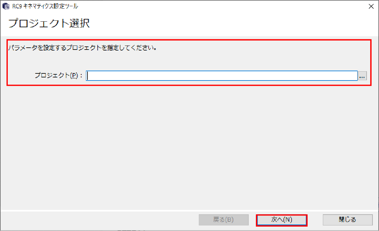 キネマティクス設定を行いたいMC9シリーズから取得した、プロジェクトを選択し、[次へ]を押します。