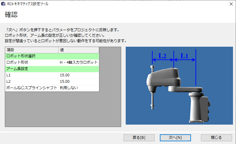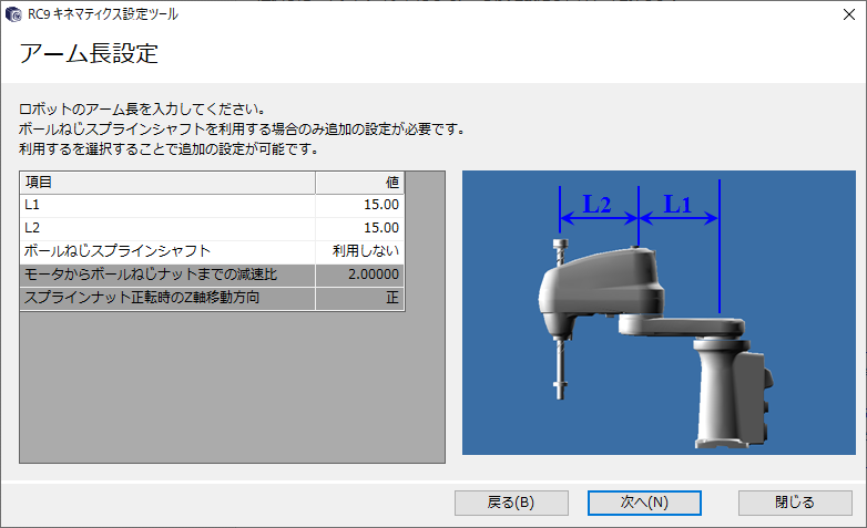 選択したロボットタイプに応じてアーム長を設定し、[次へ]を押します。
