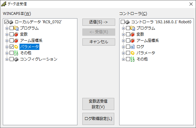 「データ送受信」ダイアログ上で、パラメータチェックボックスにチェックを入れ、送信ボタンを押します。