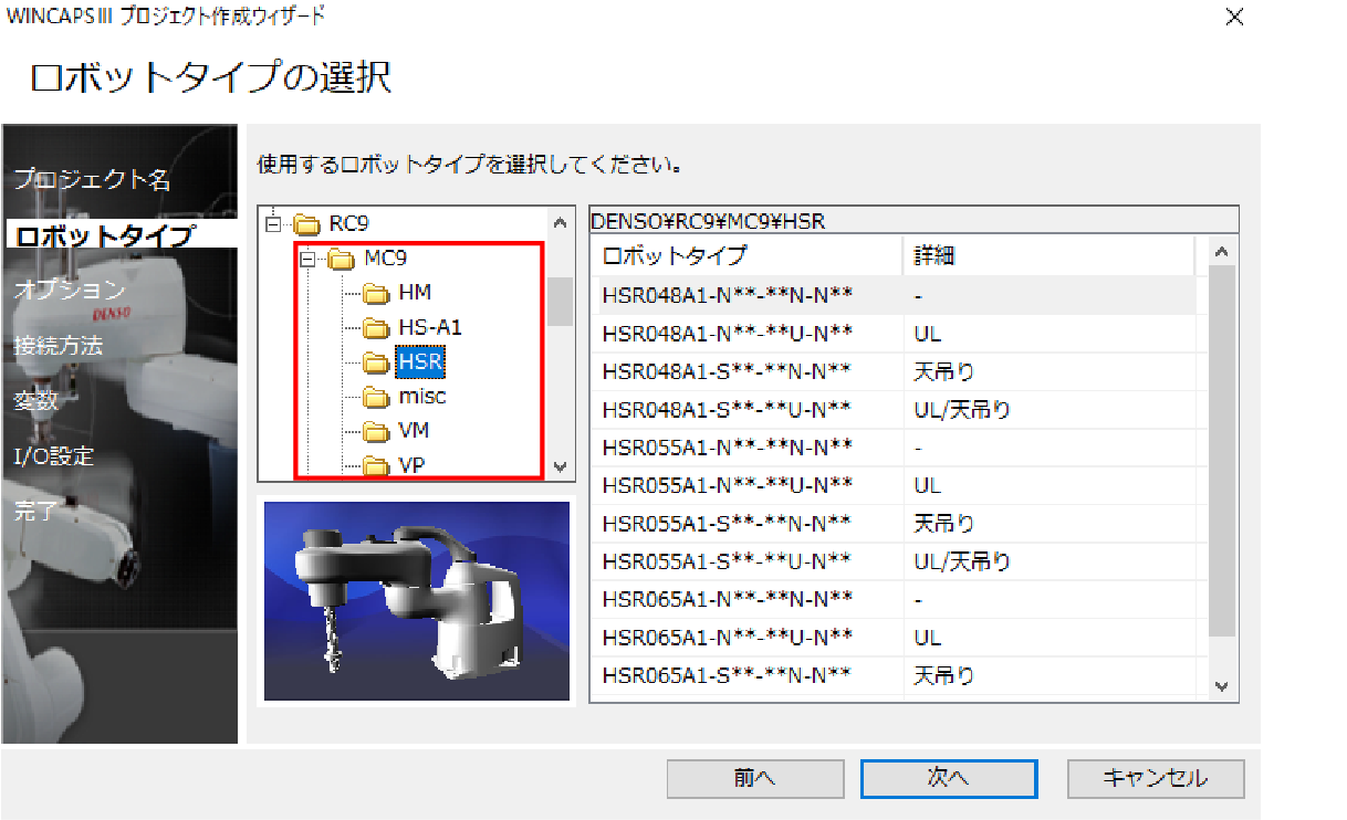 ロボットタイプ選択画面では、[RC9]の下にある[MC9]フォルダ内のロボットからMC9シリーズに接続したいロボットと同じ型式のロボットを選択し、[次へ]を押します。
