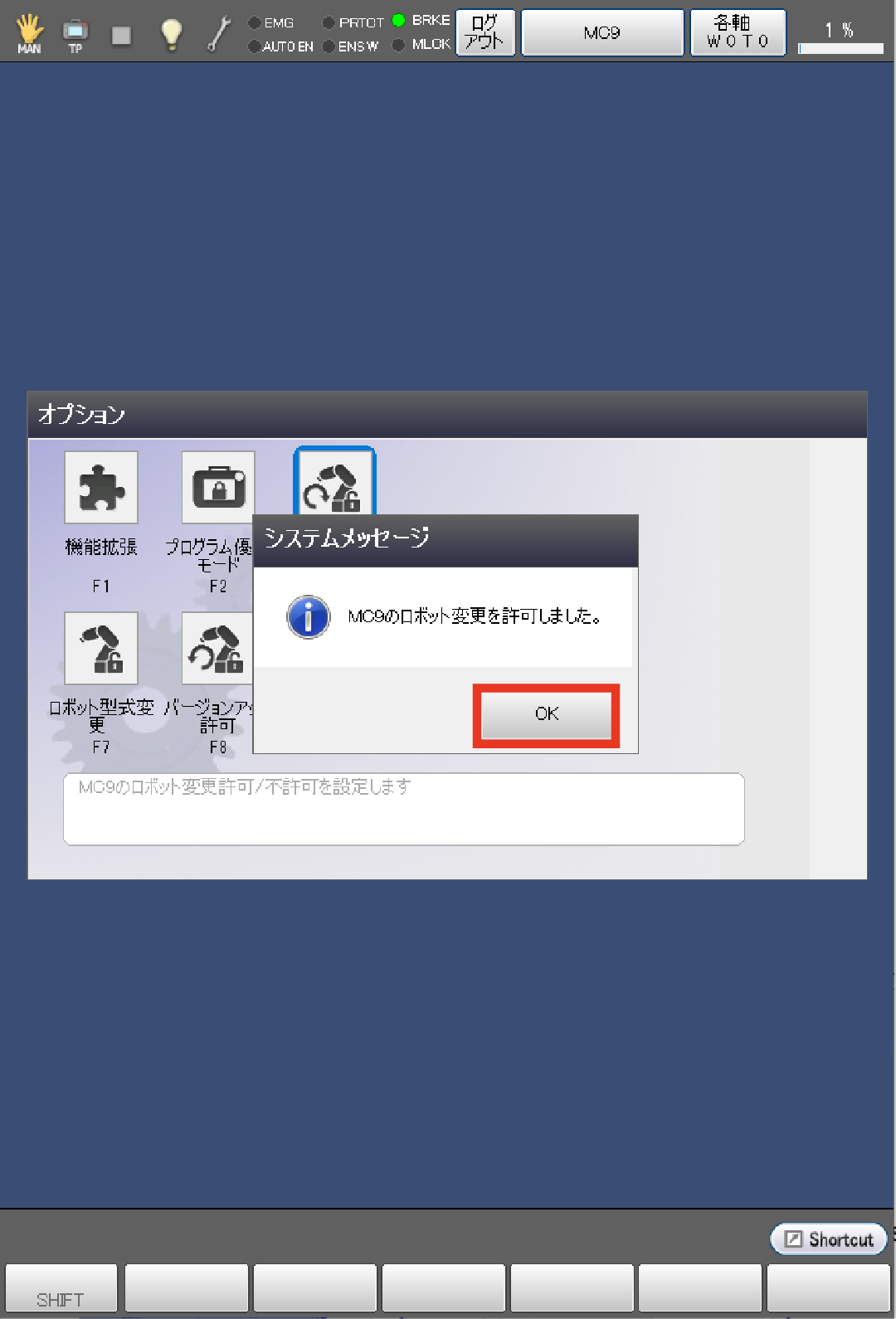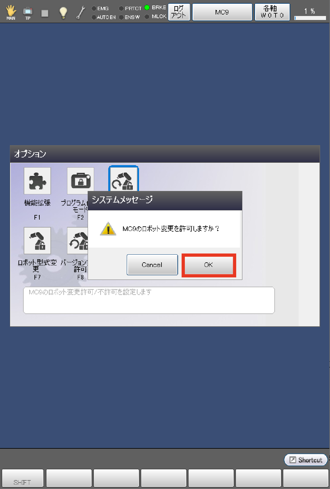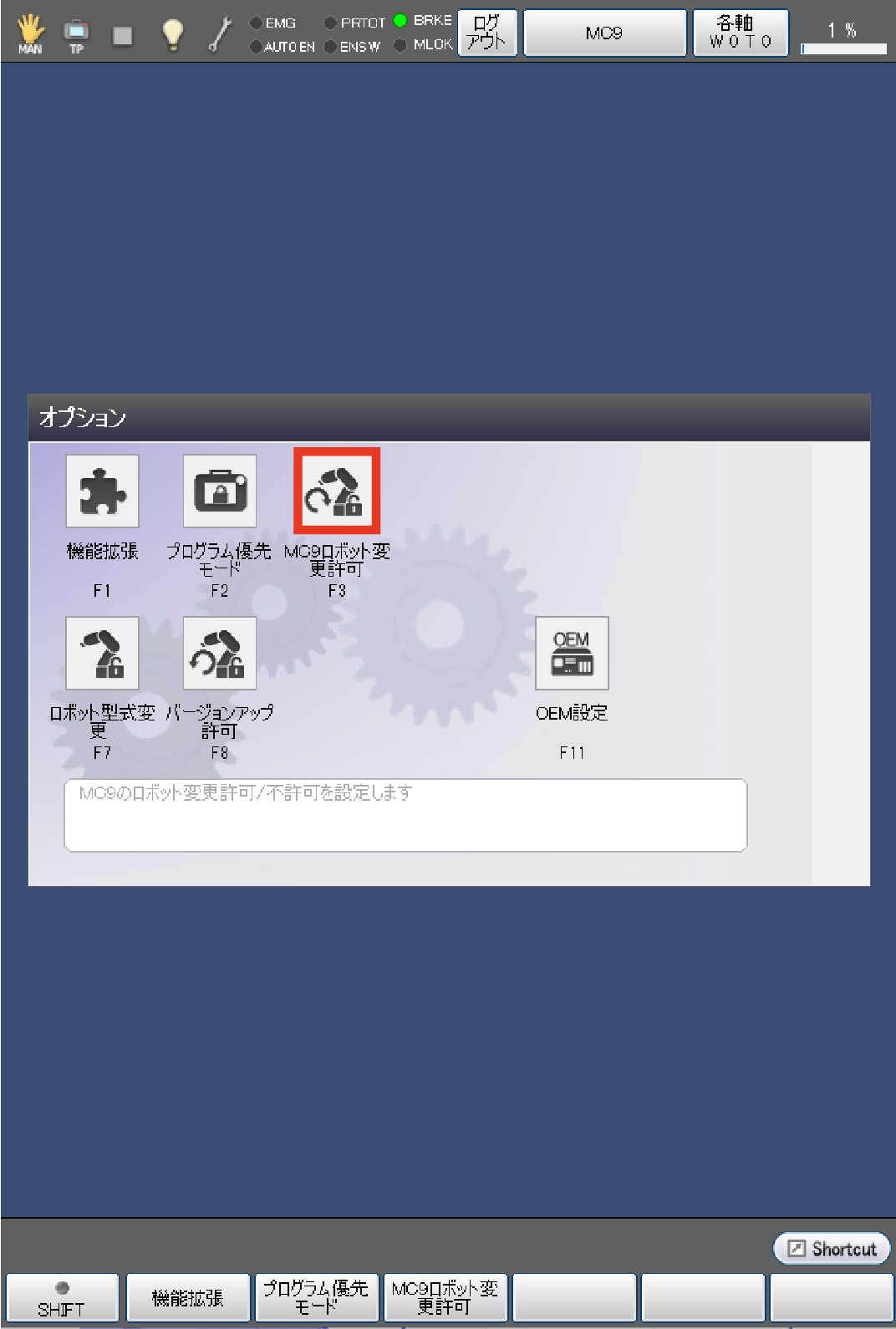 操作手順 : [基本画面] - [F6 : 設定] - [F8 : オプション] - [F3 : MC9ロボット変更許可]