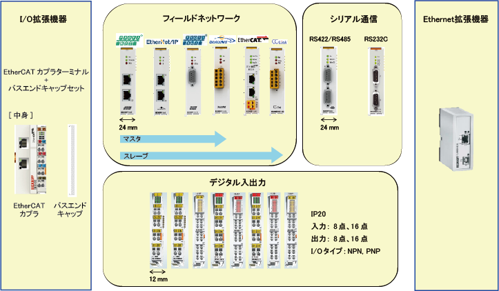 | I/O拡張用機器 | EtherCATカプラターミナル+バスエンドキャップセット *コントローラ内蔵のI/O拡張を選択する場合は、必ずセット品での注文が必要です。 |