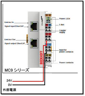 デジタル入出力ターミナルを使用する際には、EtherCATカプラターミナルのInput for Power Contactsに 下図の様に外部DC24V電源を設置し、電源供給する必要があります。