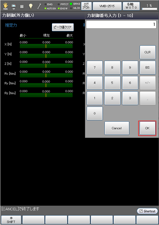 力制御番号入力用のテンキーが表示されるので、テンキーを使って、力制御番号を入力します。