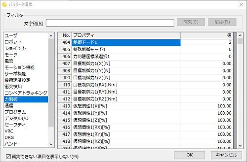 [パラメータ編集]ウィンドウの左側のメニューから[力制御]を選択します。
