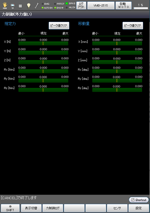 | 推定力 | 力制御座標系に加わる、モータの電流値から算出した、外力の推定値をグラフに表示します。 |