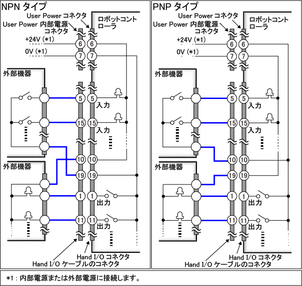 Hand I/Oケーブルは "標準" と "可動用" で端子番号と線色の組み合わせが異なります。