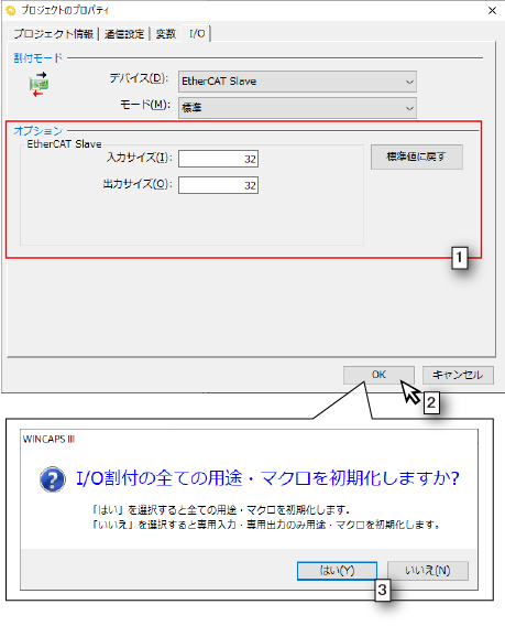 - I/O割付の初期化をするかどうか選択するウィンドウが表示されるので、「はい」か「いいえ」のどちらかをクリックします。