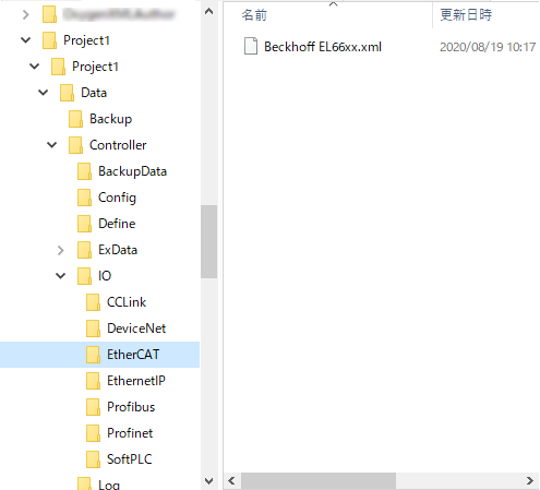 例えば"Project1"というプロジェクト名のプロジェクトのEtherCATブリッジ ターミナル用ファイルの格納場所は、下図のとおりです。